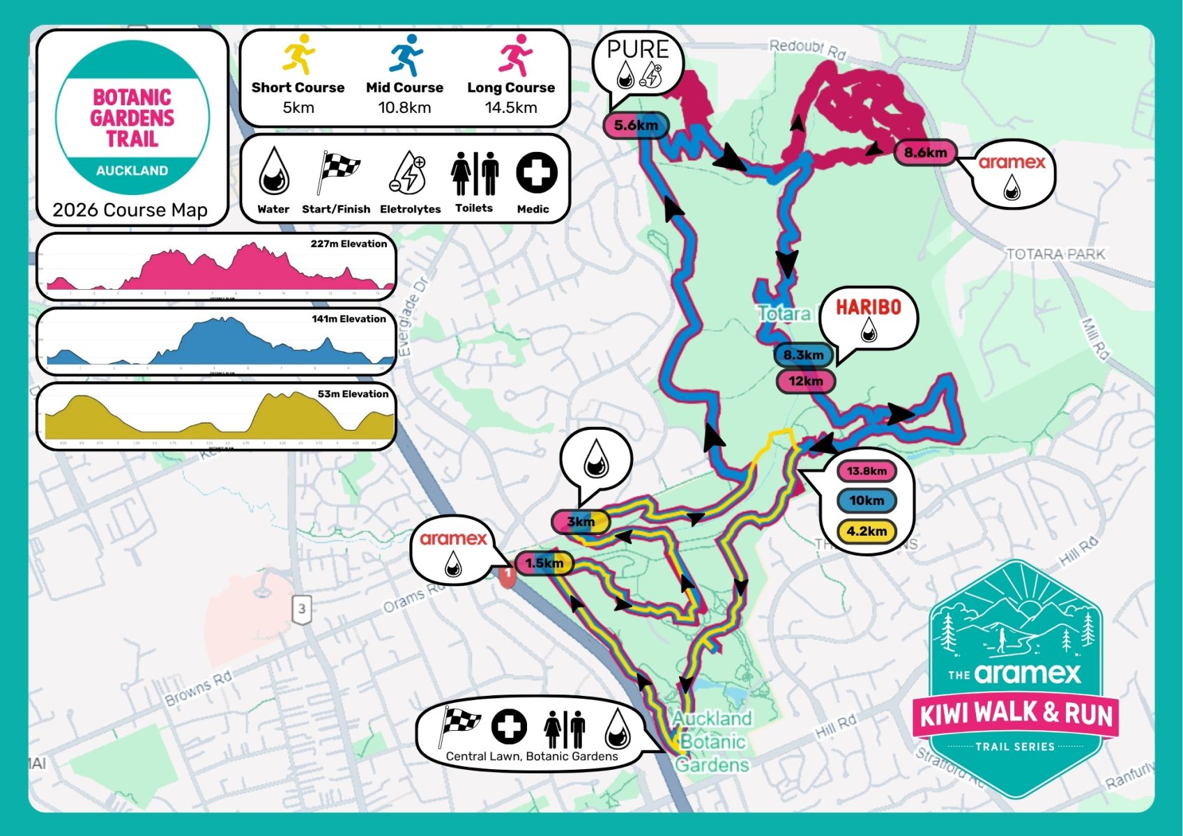 Course overview: Tucked away in the heart of Auckland, the Auckland Botanica Gardens and Totara Regional Park are one of Auckland’s best kept secrets! Our courses begin in the heart of Auckland gardens, and have you meandering through the gardens before making your way out into the native bush of Totara Park. The mid and long course will get to explore more of this stunning regional park, moving through pockets old growth native bush before rejoining the short course in the Nikau forest and exploring more of what the Botanic Gardens has to offer!