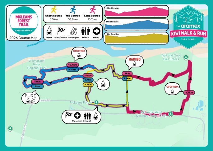 Course overview: McLeans Islands is one of Christchurch’s hidden treasures! This course weaves in and out of beautiful old grown pine forest and along river banks treating you to stunning natural scenery and pristine farmland. Keep an eye out through the pines for a glimpse of the meandering Waimakariri River.
