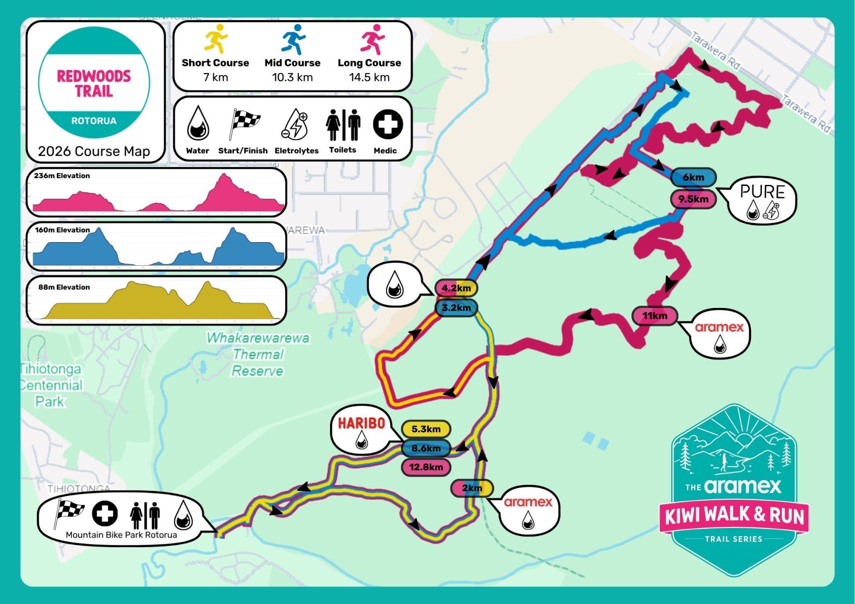 Suitable for: Great for a weekend adventure away in Rotorua. The long course is a good distance for the trail runner looking for a challenge! The mid course is a good distance day out of keen walkers and runners whilst the short course is an easy loop great for first timers and all fitness levels.