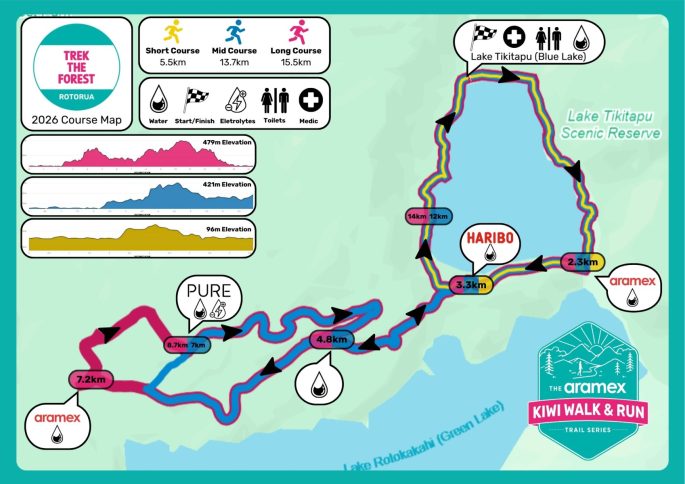 Course overview: Located on the beautiful Lake Tikitapu (Blue Lake,) this course weaves around Lake Tikitapu for the short course, whilst the mid and long delves deeper into the stunning Whakarewarewa forest, with glimpses of Green Lake and beautiful old growth forest, this course will leave you speechless at the beauty of our backyard.